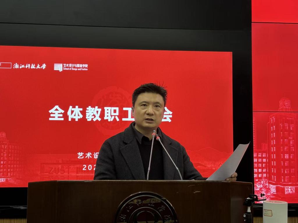 为全面总结学院2025年度各项工作,进一步统一思想、凝聚共识,明确新一年发展目标与方向,1月15日中午,艺术设计与服装学院在B4-102召开全院大会暨领导干部述职会议。会议由学院党委书记蒋邢飞主持,学校审计处田锦处长到会指导,全体教职工参加会议。